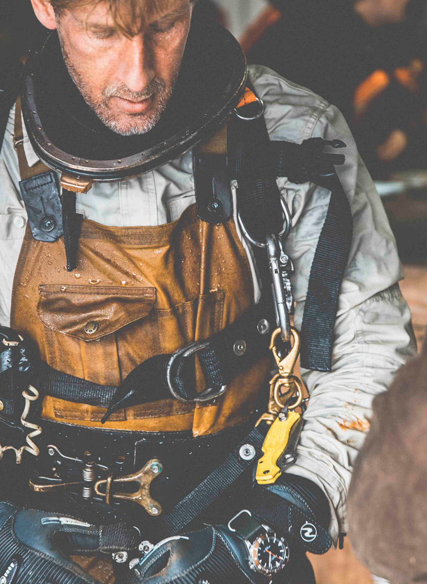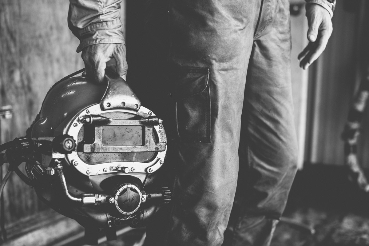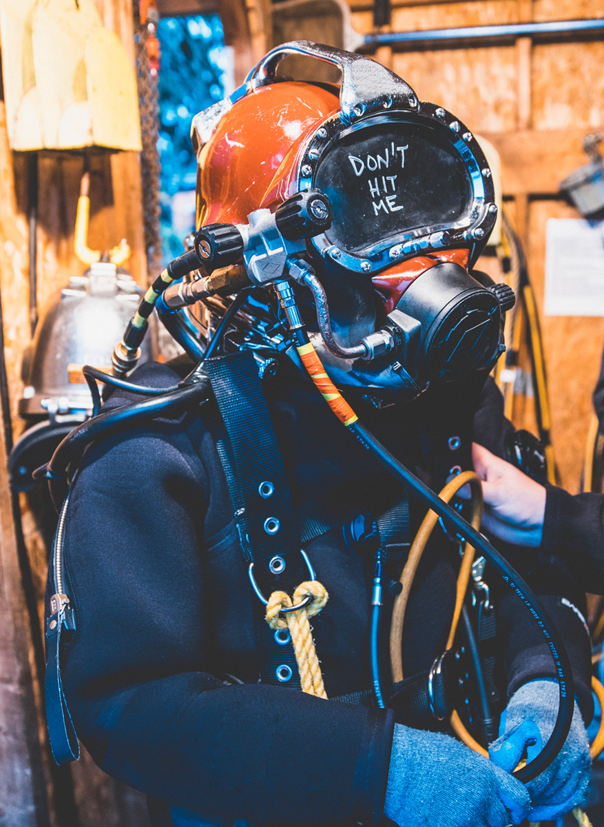 Instructor Jeff prepares to go underwater. He wears a shirt and bibs over his dry suit as a protective layer from jagged metals, barnacles, and other hazards that could compromise his diving gear.