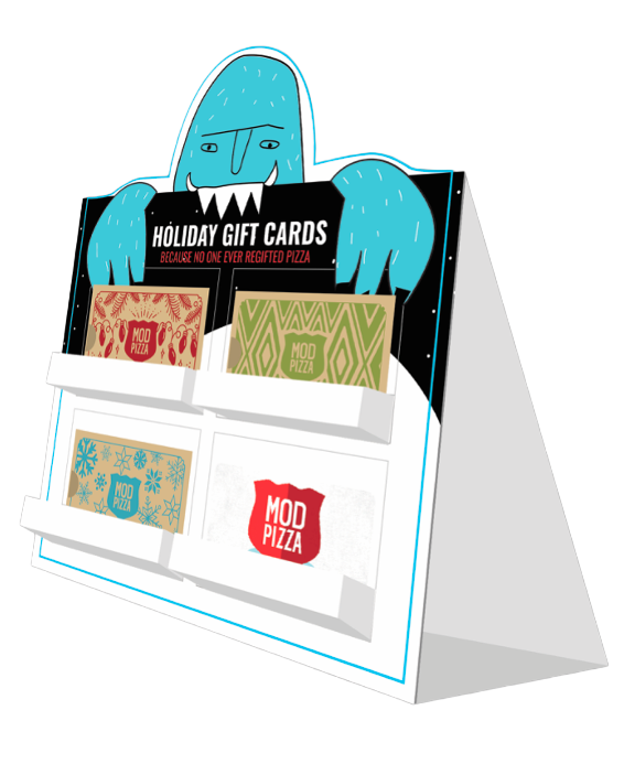 To boost gift card sales, we developed promotional language around our program, created new holiday-themed gift card sleeves, and built a bespoke gift card display stand in-restaurant. Gift card sales outperformed the previous year’s numbers by about 10 to 1.