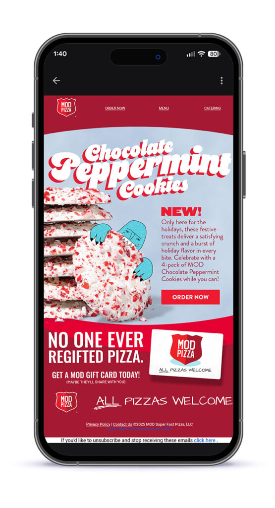To celebrate the 2025 Holiday Season, we focused on three main brand messages: a new chocolate peppermint cookie, gift cards, and a partnership with One Warm Coat. We needed to create a design language for these messages and any surprise additions that would give us a consistent look for the last quarter of the year. Our solution was a campaign built around a family of pizza-loving Yetis. With this theme, we had the flexibility to amplify great products and celebrate the FUN of the holidays.