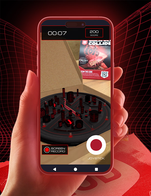 Production timeline limitations in the campaign made for an innovative approach to our packaging. Lead times were simply too long to be able to supply TRON-branded pizza boxes. So we drew inspiration from the grid and developed an AR experience that guests triggered via a QR code sticker on every box. Their pizza box then transformed into a light-grid city in a timed race to gather power-ups atop the franchise’s iconic light cycles. Guests could play anywhere, including at a Nine Inch Nails performance at the TRON: Ares premiere!